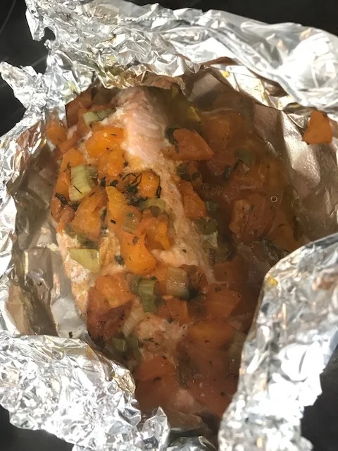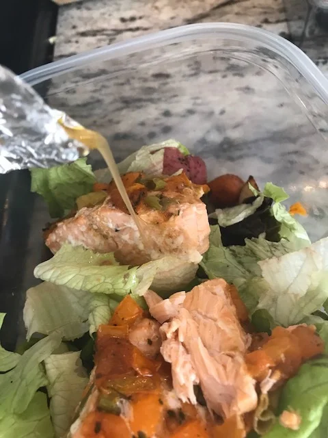 Today I topped some roasted veggies and lettuce with the salmon and remaining oil for a nice hearty salad. No dressing required.